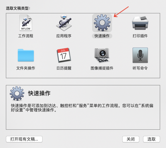 首先,我们在 Application 中启动 Automator,选择“快速操作”