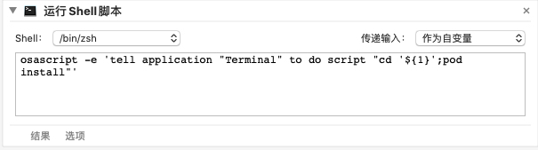 osascript -e 'tell application "Terminal" to do script "cd '${1}';pod install"