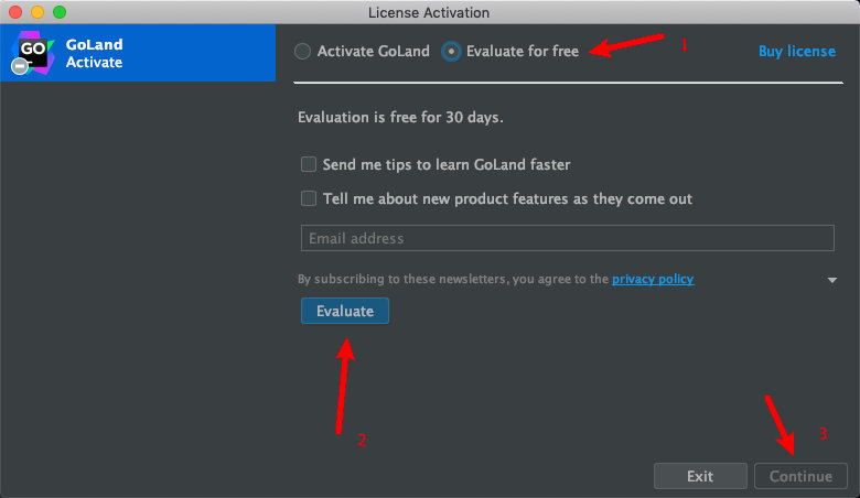 - 安装完成之后进入License Activation界面,直接选择Evaluate for free,操作步骤如下图所示