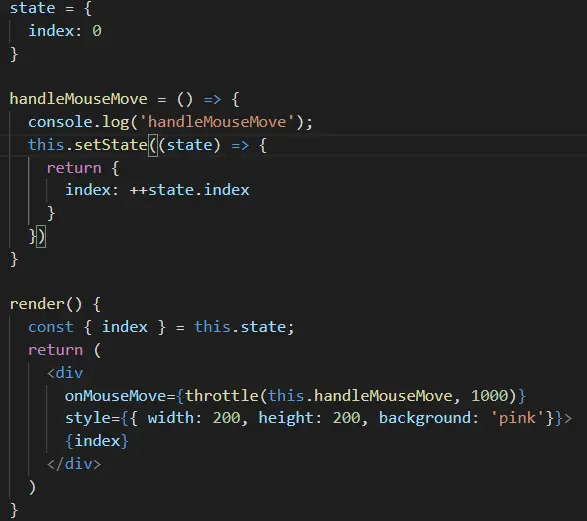 当我们需要在界面中显示当前触发的次数,在handleMouseMove 的时候 setState, 发现函数并没有起到节流的效果,由于触发事件会立即执行,所以立即 setState() 之后会重新 render(), 重新事件触发, 事件又会立即执行。