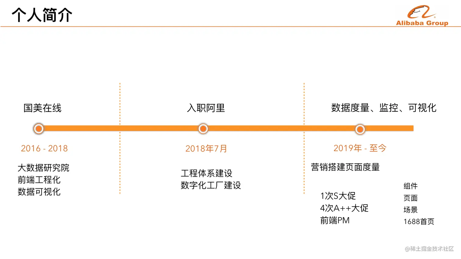 2018 年 7 月份入职阿里 CBU 部门,主要负责工程体系建设和数字化工厂建设。2019 年负责营销活动领域,负责 1688 各种营销会场的组件管理和页面搭建,历经 6 次大促,担任一次 PM,4次超产日 A++ 大促 PM。