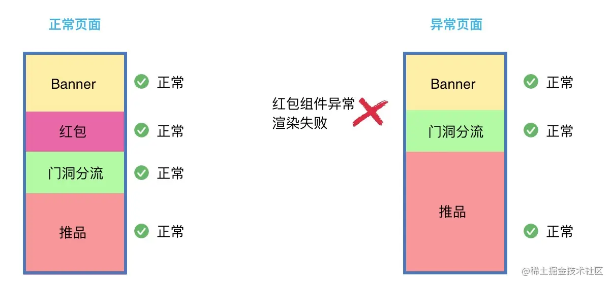 阿里平台已经做了很多页面级别的监控,首屏加载时间、网络请求时间、图片加载时间、白屏率、JS 异常。优化了页面关卡还得过组件自己这道坎,不然当遇到下面这种整体正常,个别组件不出现的情况就监控不到了。组件都是分模块加载和渲染的,单个组件的失败不影响整体的渲染。不熟悉页面结构的同学看到下图右边的页面甚至都不会觉得有问题。