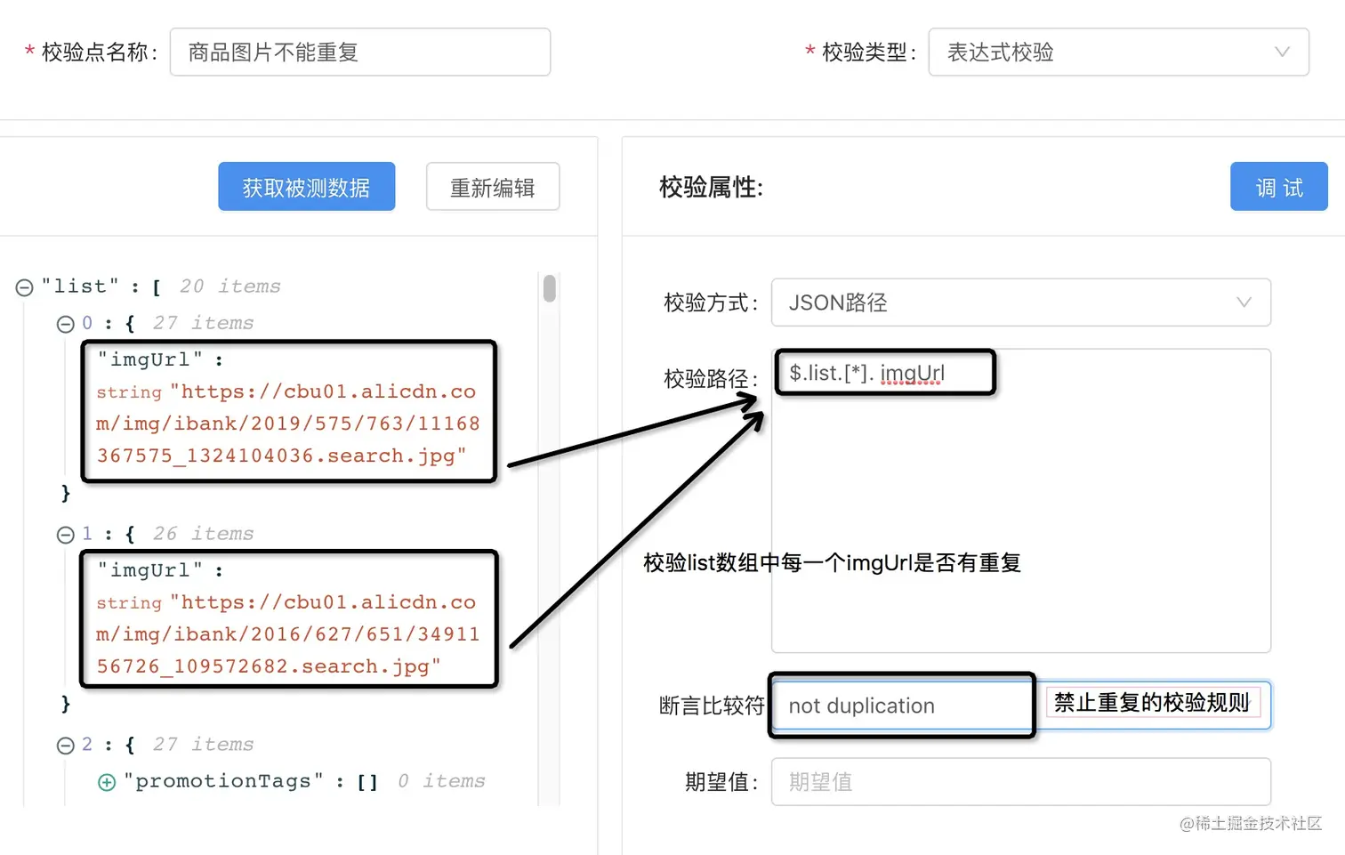 监控方案:一个组件一个数据源,数据源的结果有自己的格式。如下图所示,我们设定数据结构中的一条字段链路为监控卡点,配置上校验规则。