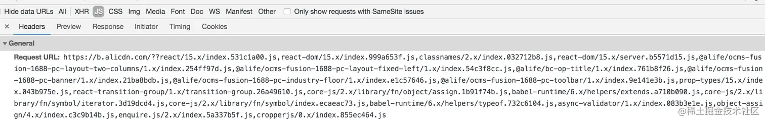 - 模块加载时间。组件虽然是单个模块渲染,加载的时候实际上是会把所有组件的公共依赖全部提取出来合并成一个 JS 请求(称之为 JS comb),然后把组件们自身的脚本请求合并成一个 js 请求,避免多个组件之间的重复依赖冗余,合并请求减少请求频率提高加载性能。带来的影响就是无法统计单个组件的加载耗时,所以我们调过网络请求这部分,模块加载时间就归到首次引用到模块时的自执行时间。