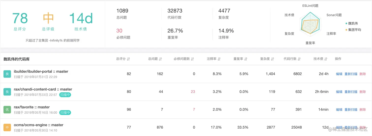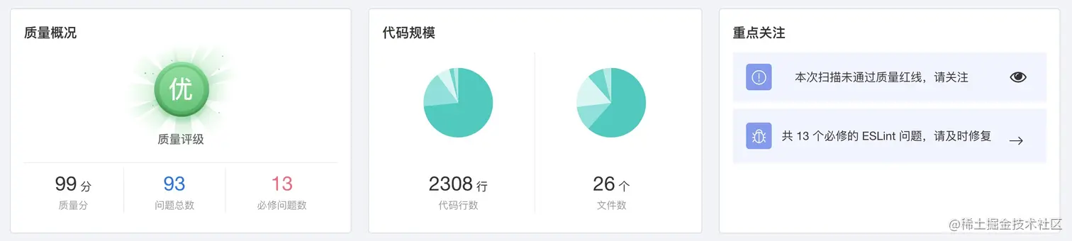 答:集团使用 eslint 和 sonar 研发了一个代码质检平台,前端工程在提交和构建的时候通过质量插件把影响运行的规则行数抛出(比如给常量二次赋值),其它问题可选择性修复。代码发布到日常环境后,系统会自动给当前分支创建一个检查任务,然后把各种触发规则的部门全部进行归类统计,根据 Blocker/Critical/Major 级别的数量给出分数和优良中差的评价,以及分析修复需要花费的时间。团队代码质量报告一比较,push 去优化代码。