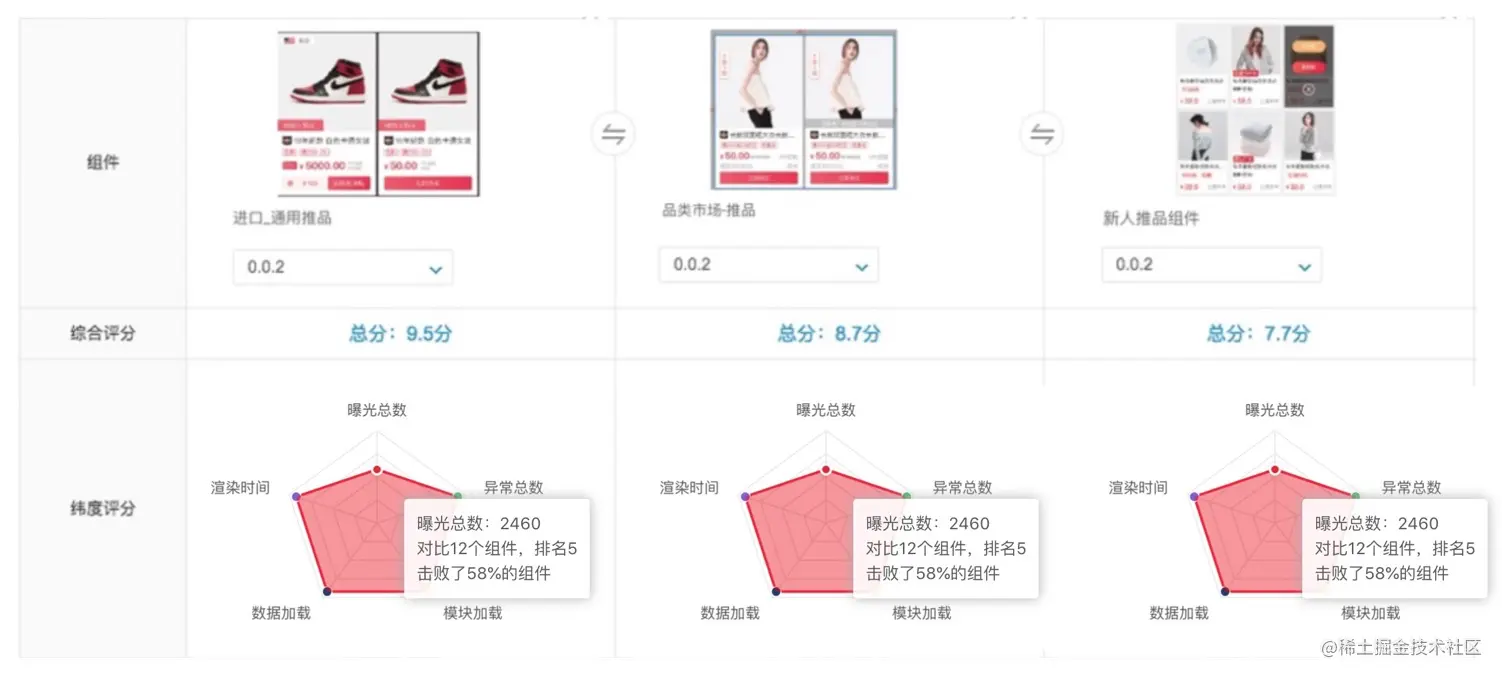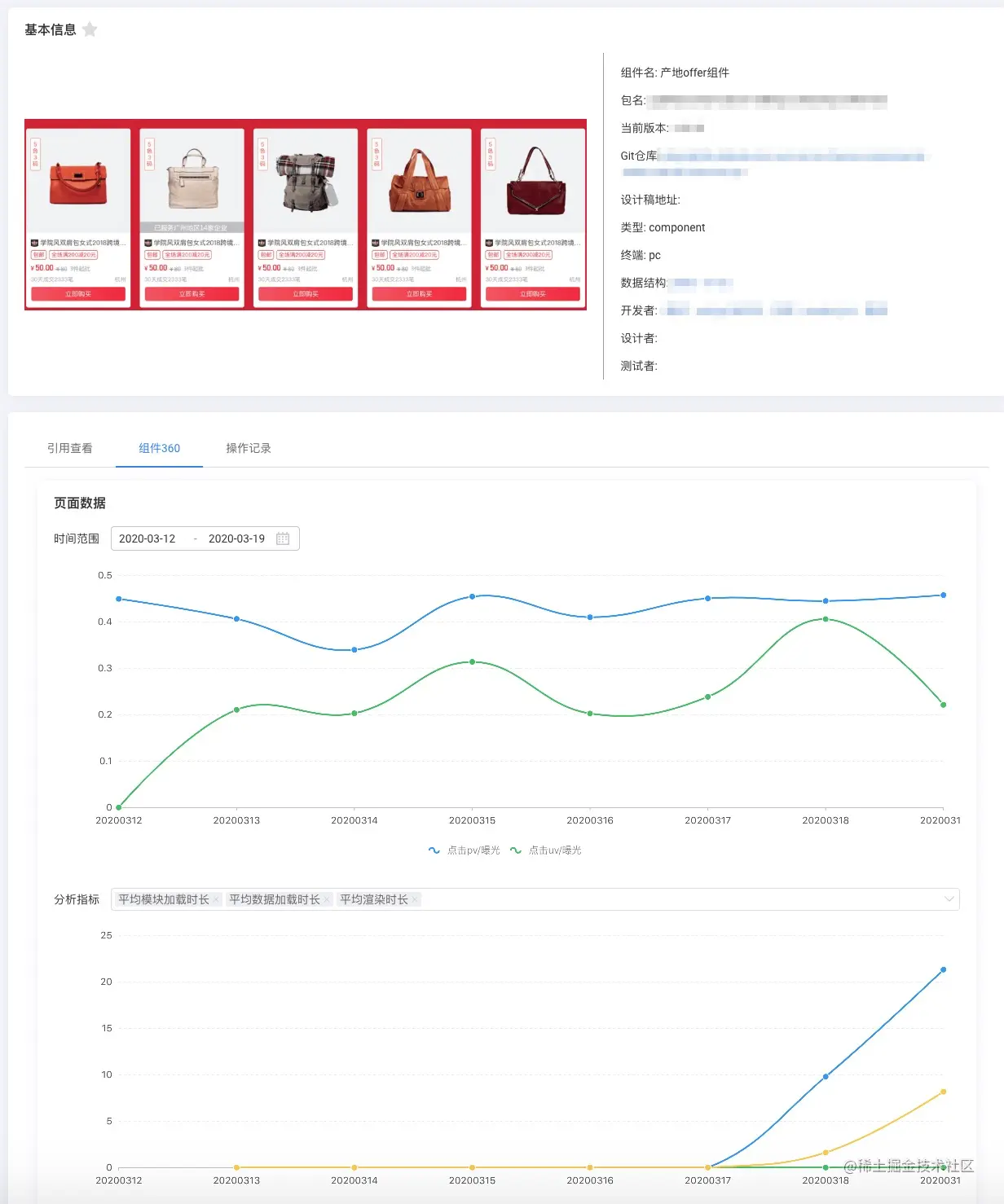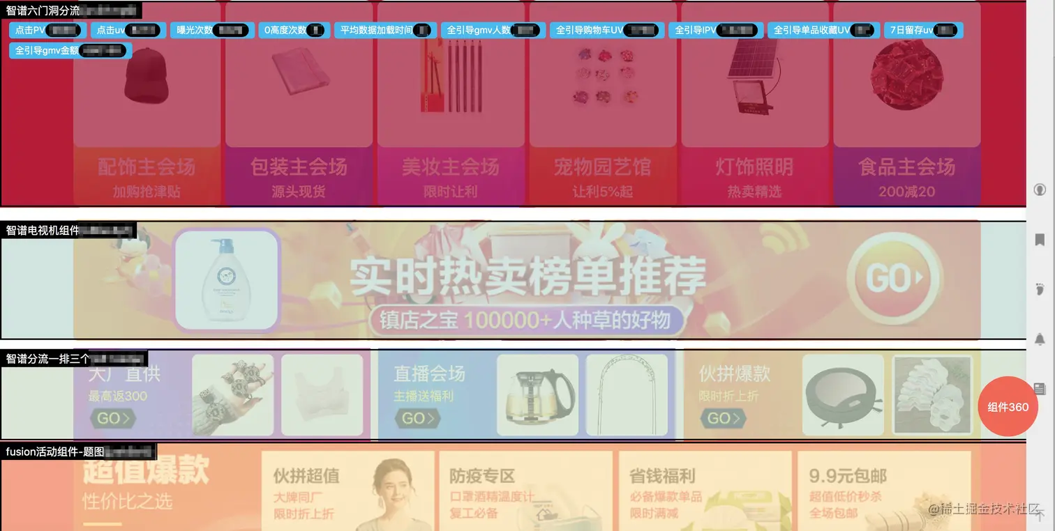 流量的入口和去向最直接的行动点全都是聚焦在组件上的,当前页面的 PV 其实就是上一个页面组件的点击数量,页面转化率也就是组件的点击转化率。优秀的组件不仅有迷人的 UI、吸引人的内容、楼层位置、曝光量和自身稳定性都非常重要。每一个组件都是经过心智策略的包装、产品思维的提炼、加上高超的技术,灵感 + 智慧 + 汗水的成果,除去一次性的消费品,朴实的组件也是有可能经过抛光打磨重放光彩。一贯表现良好的组件更应该成为楷模,把自身的价值发挥到更大。为此,营销&工程团队结合搭建平台启动了组件 360 计划。