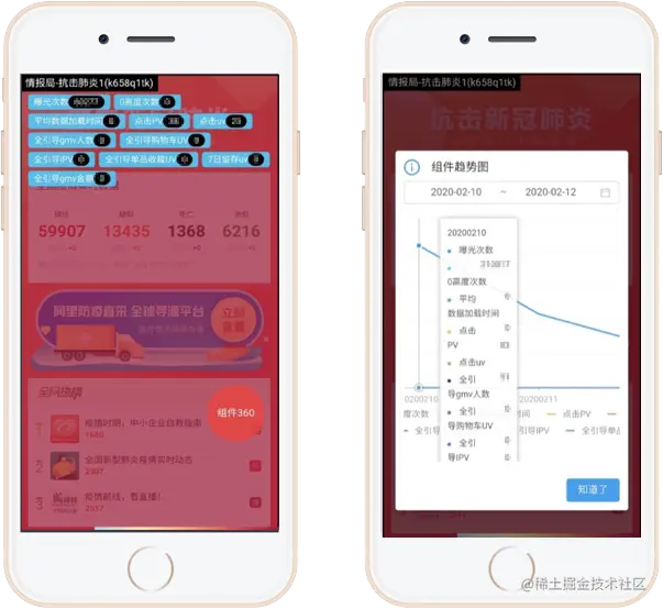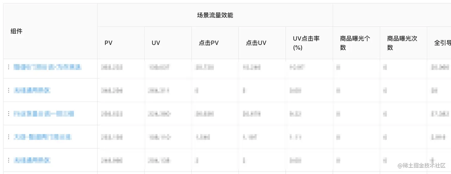 对于投放出去的页面,大家非常关心效能数据怎么样,去数据分析平台上你看到的组件数据是这样的。