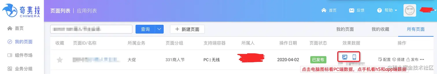在你搭建页面的列表中找到要看数据的页面,在“效果数据”列中点击“电脑”图标,会跳转到这个投放出去的页面上。和普通情况下看到的不一样,页面上多了好多五颜六色的蒙版,上面标注了组件名称,并且精准地覆盖在对应的区块上。蒙版的颜色代表的是第一个指标数据在当前页面上的热度(这是一个区块版的热力图)。