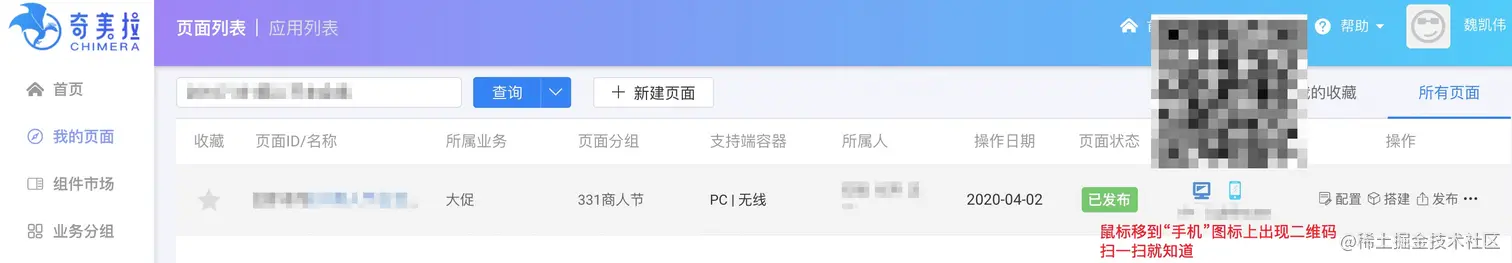 还是在奇美拉平台上找到目标页面,在“效果数据”那列,把鼠标移动到“手机”图标上即可出现二维码。使用任何二维码识别工具(浏览器、微信、支付宝、淘宝、钉钉······)扫一扫。
