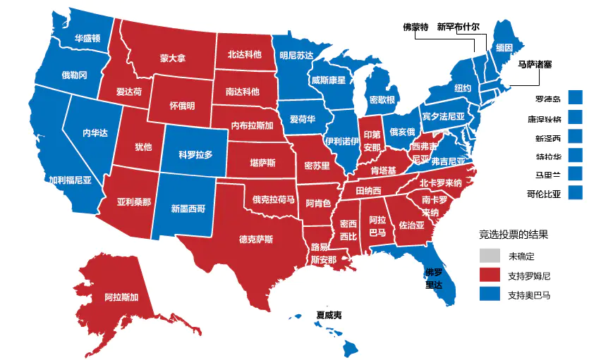 上图展示的是2012年美国总统大选可视化的图片,红色代表支持罗姆尼,蓝色代表支持奥巴马,一目了然。