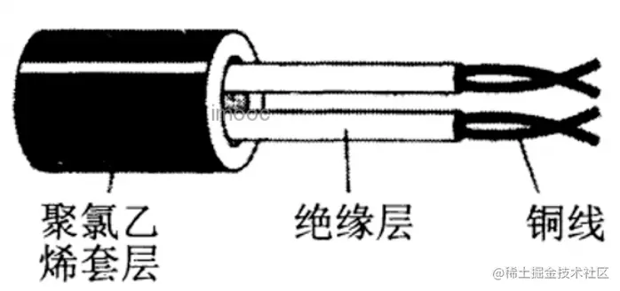 从外至内由 聚氯乙烯套层、绝缘层、铜线 组成。