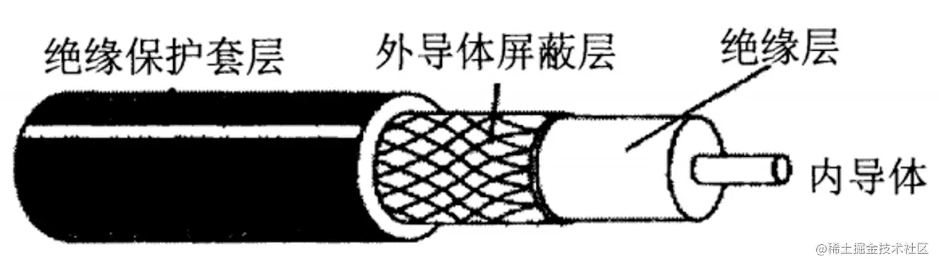 从外至内由 绝缘保护套层、外导体屏蔽层、绝缘层、内导体 组成。