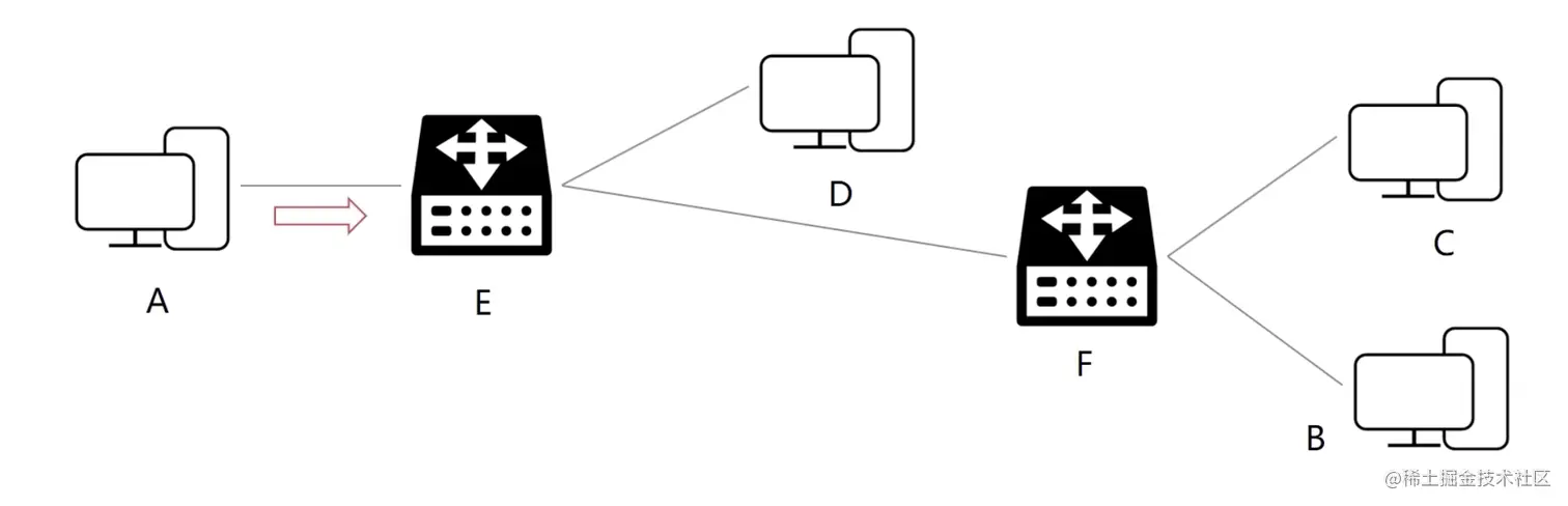 - 7)、E 把数据报交给数据链路层,并告知目的 MAC 地址为 F。
