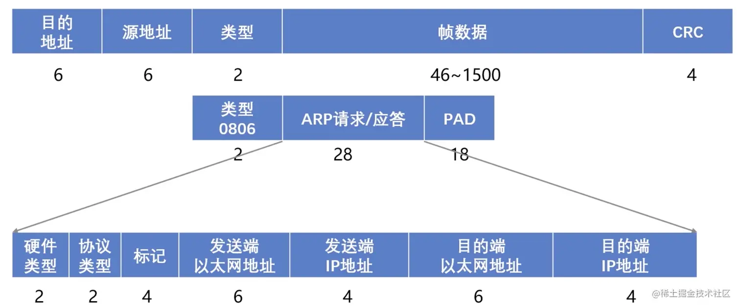 - 如果是 ARP 请求/应答,则 类型为 0806,帧数据 = ARP 请求/应答(28字节) + PAD(18字节)。