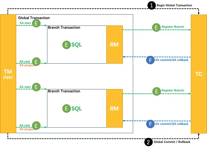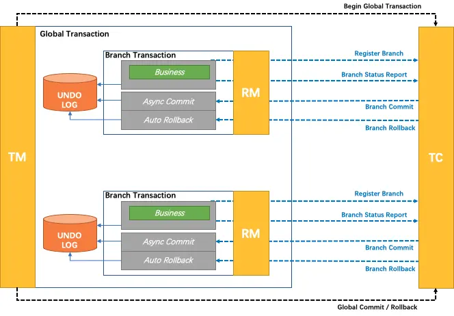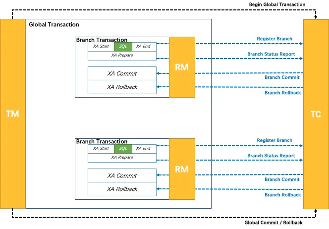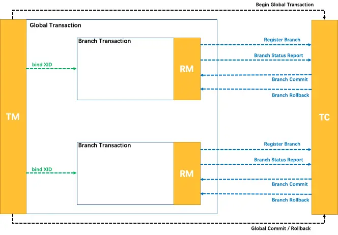 TM 向 TC 请求发起(Begin)、提交(Commit)、回滚(Rollback)全局事务。 TM 把代表全局事务的 XID 绑定到分支事务上。 RM 向 TC 注册,把分支事务关联到 XID 代表的全局事务中。 RM 把分支事务的执行结果上报给 TC。(可选) TC 发送分支提交(Branch Commit)或分支回滚(Branch Rollback)命令给 RM。\