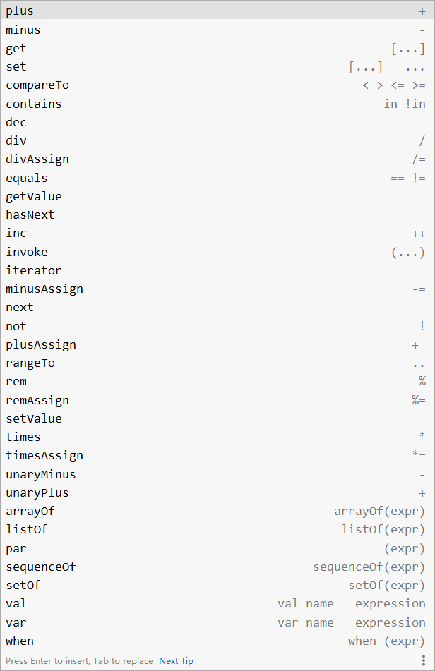 - 判断Kotlin是否支持重载该操作符,Kotlin支持重载的操作符如下(IDE提示):
