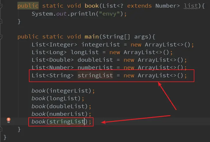 这两种写法有区别吗?有的,前面说过类型通配符一般是使用?来代替具体的类型实参。上面那种写法就仅仅是特指String一种类型,但是下面这种写法表明你可以是String类型,还可以是它的子类型。