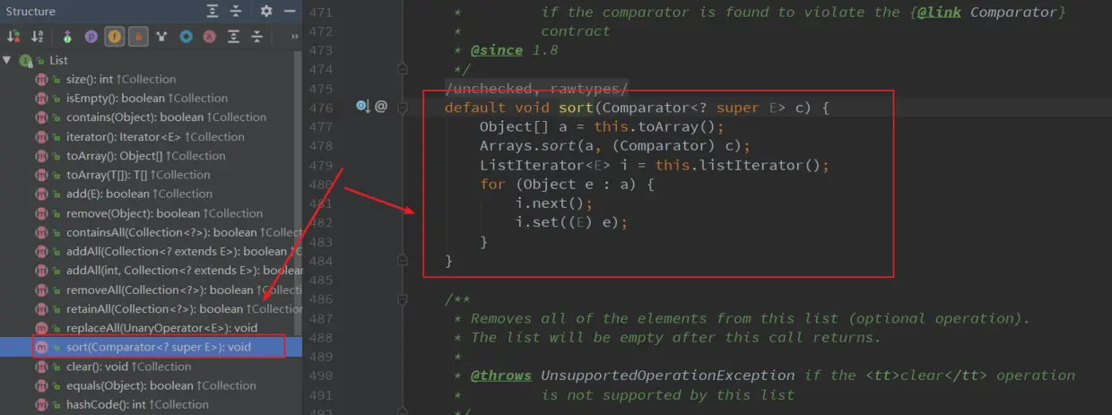 所谓通配符的下边界,其实就是规定传入的类型实参必须是指定类型的父类型(包含本身),一般使用<? super 指定类型>格式进行设置。其实通配符下边界的使用比上边界更为广泛,尤其是在Java源码中体现的更为全面。以最常见的List来进行说明,里面有一个sort方法:
