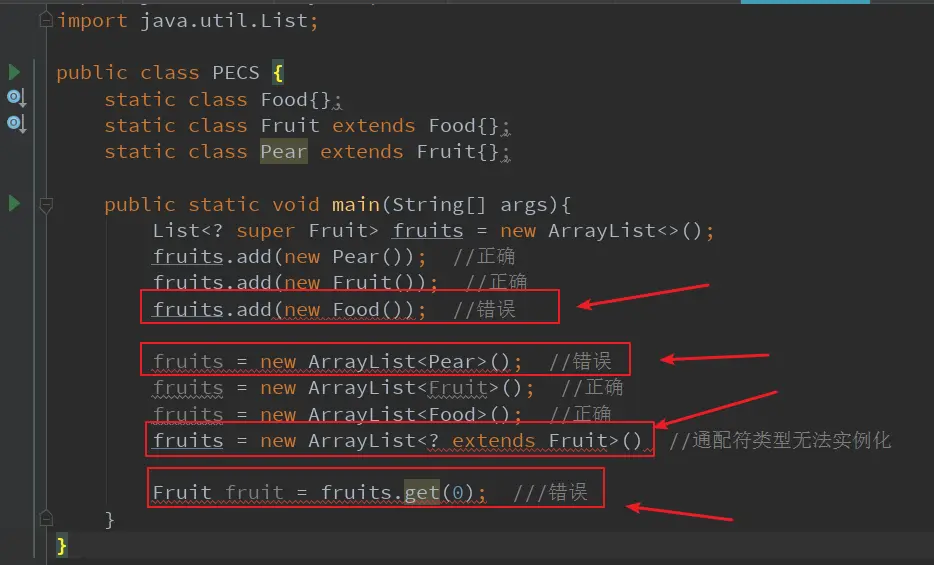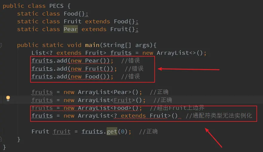 如果你仔细理解了这句话:“类型通配符一般是使用?来代替具体的类型实参。”那么你就知道上面的代码出错在哪里。类型实参,这个fruits都已经是某个具体的类型,但是类型并不知道,所以怎么还会允许你往里面添加具体的类型对象呢?肯定是不行的。但是你可以在实例化的时候指定它的类型,只要不超过泛型设定的上边界(上限)Fruit,那都是允许的,所以你实例化Pear和Fruit对象都是可以的。后面一个是因为超出边界,另一个是非法实例化通配符类型而导致出错。但是需要说明的是,虽然不知道这个fruits是哪个具体的类型,但它肯定是Fruit的子类,因此你获取它是没有任何问题的。