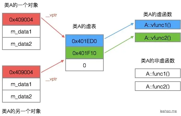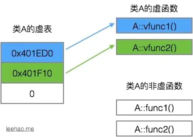 类A包括两个虚函数,故A vtbl包含两个指针,分别指向A::vfunc1()和A::vfunc2()。