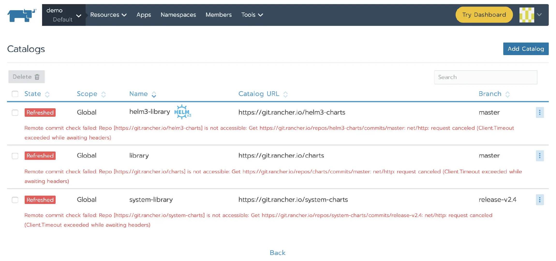2020/05/07 03:31:33 [ERROR] CatalogController library [catalog] failed with : Remote commit check failed: Repo [https://git.rancher.io/charts] is not accessible: Get https://git.rancher.io/repos/charts/commits/master: net/http: request canceled (Client.Timeout exceeded while awaiting headers)