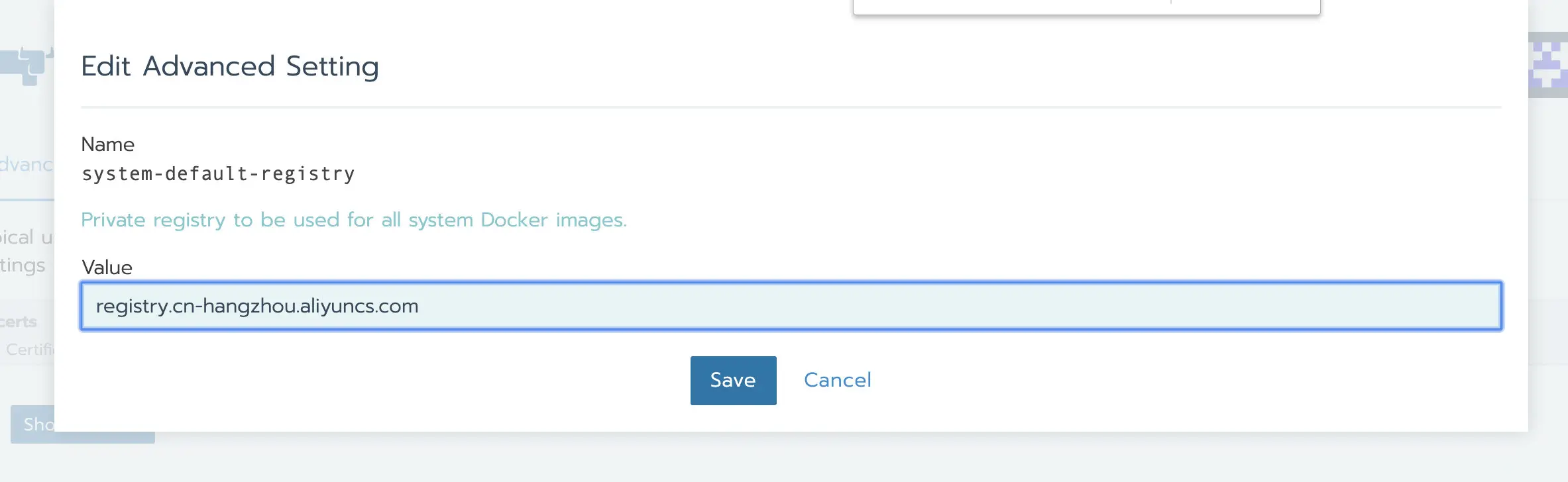从UI导航到Settings,然后编辑system-default-registry,Value设置为registry.cn-hangzhou.aliyuncs.com