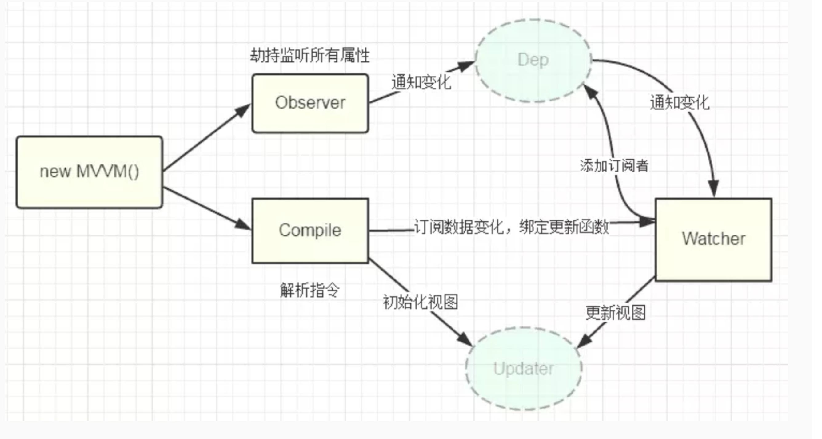 3、实现一个 Watcher,作为连接 Observer 和 Compile 的桥梁,能够订阅并收到 每个属性变动的通知,执行指令绑定的相应回调函数,从而更新视图