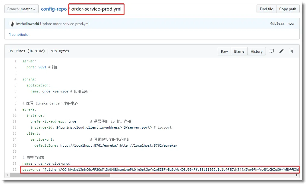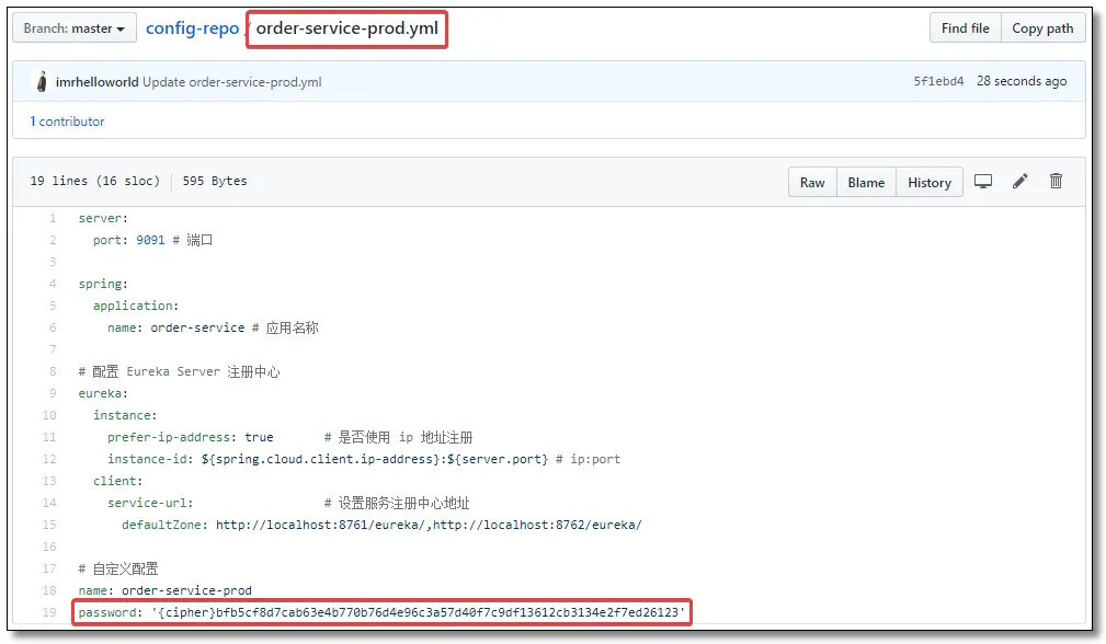 把加密后的数据更新到 Git 远程仓库的配置文件中。值得注意的是需要在加密结果前添加 {cipher} 串,如果远程属性源包含加密的内容(以开头的值{cipher}),则将其解密,然后再通过HTTP发送给客户端。