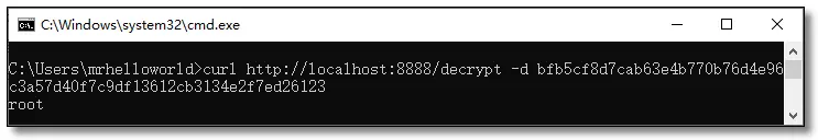 使用 curl 命令访问 /encrypt 端点对属性值 root 进行加密。反向操作 /decrypt 可解密。