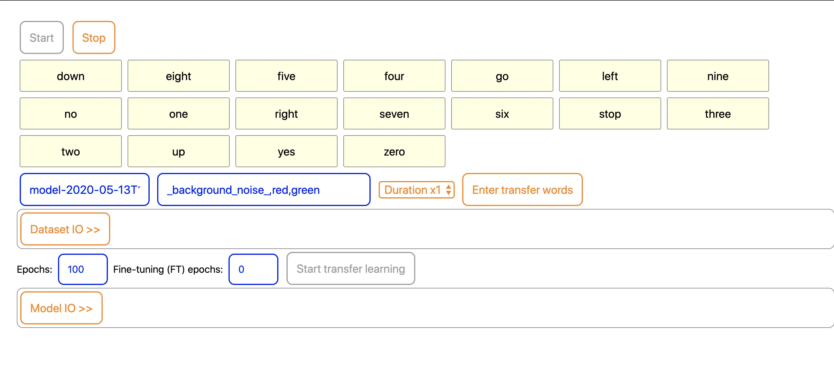 具体操作: 在浏览器中采集自定义语音训练数据, 包括背景噪音, 让模型知道哪些声音不用被识别, 然后保存并下载二进制的模型文件