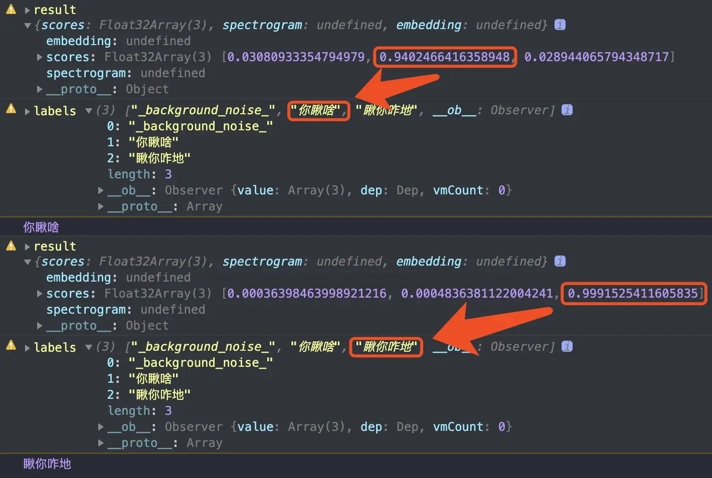 如下图, 第一次测评你瞅啥的可能性为94+,第二次测评瞅你咋地的可能性为99+