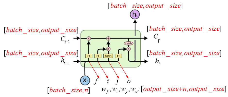 可以看出,一个LSTM单元接受输入的shape仍旧为[batchsize,n],如果每个样本包含timestep个时刻,则最后的输入shape同样为[batchsize,timestep,n](或者[timestep,batchsize,n])。