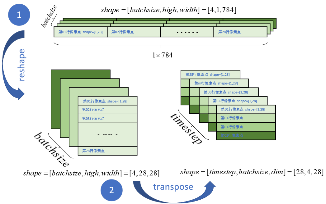 所以,对于整个数据集来说:我们第一步要做的就是将其reshape成[batchsize,high,width]的这种形式;然后第二步就是将其按行分割成28个部分,变成[timestep,batchsize,dim]。以batchsize = 4为例,可以画出如下示意图:(题主请注意,此时的batchsize=4就是指一共有4张图片,而timestep=28则指的是我们将一张图片分割成28个时刻)
