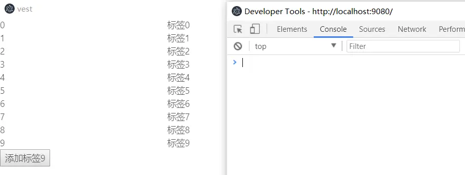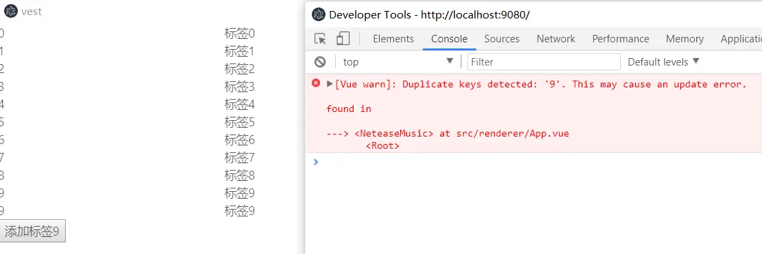 可以看到,页面上出现了一条新的标签9。但是浏览器报错key重复了。因为v-for我是使用id作为key的,有两条相同的数据在视图上,这是不合理的现象。如果我们使用map,就完全不用去担心这个事情。我们无论set多少次都不会有相同的数据影响到重复的key,新的key会替换旧的数据。