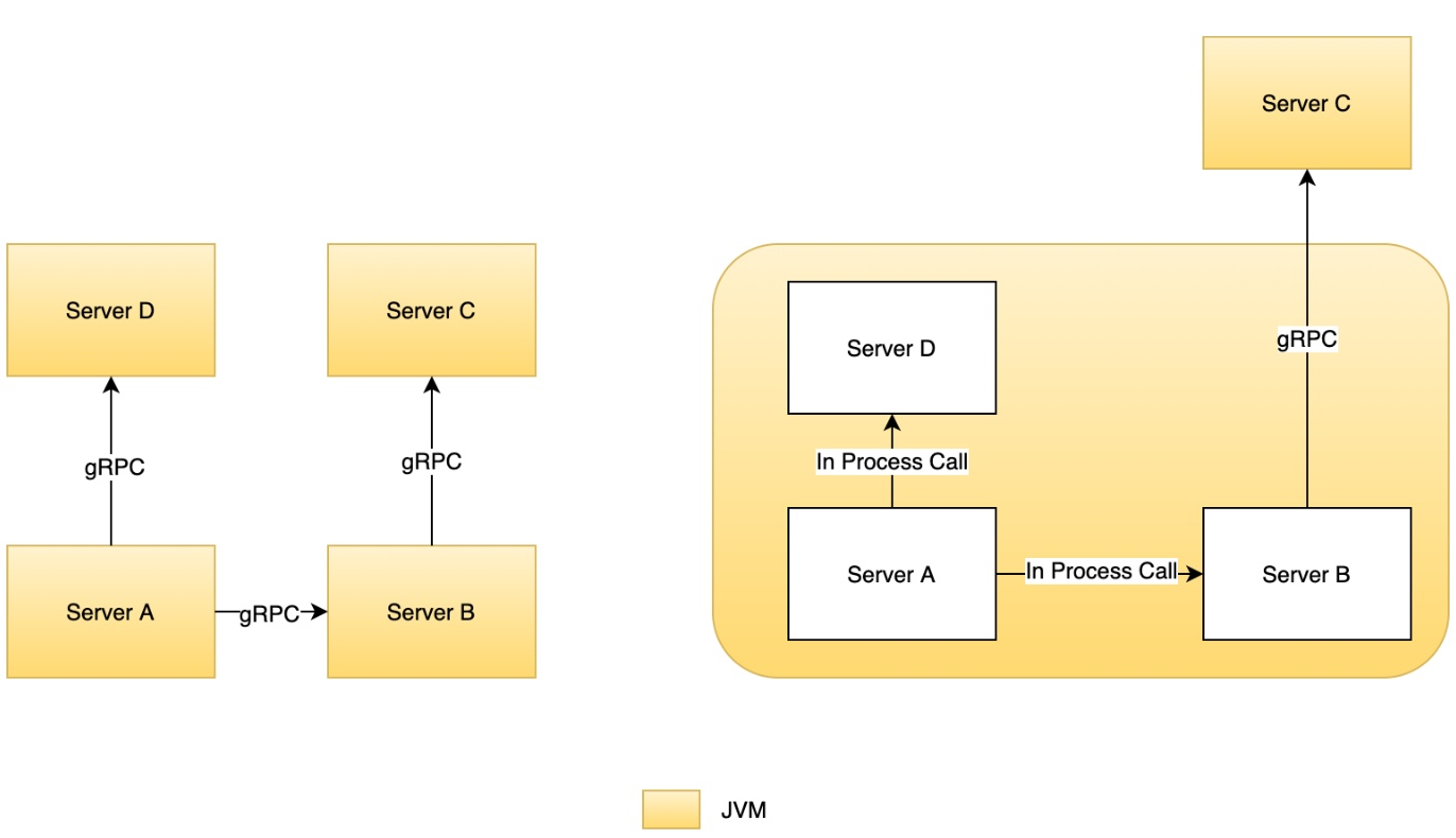 运行在同一个 JVM 进程上的服务间通讯由 gRPC 远程调用切换成堆栈调用