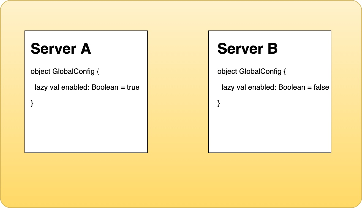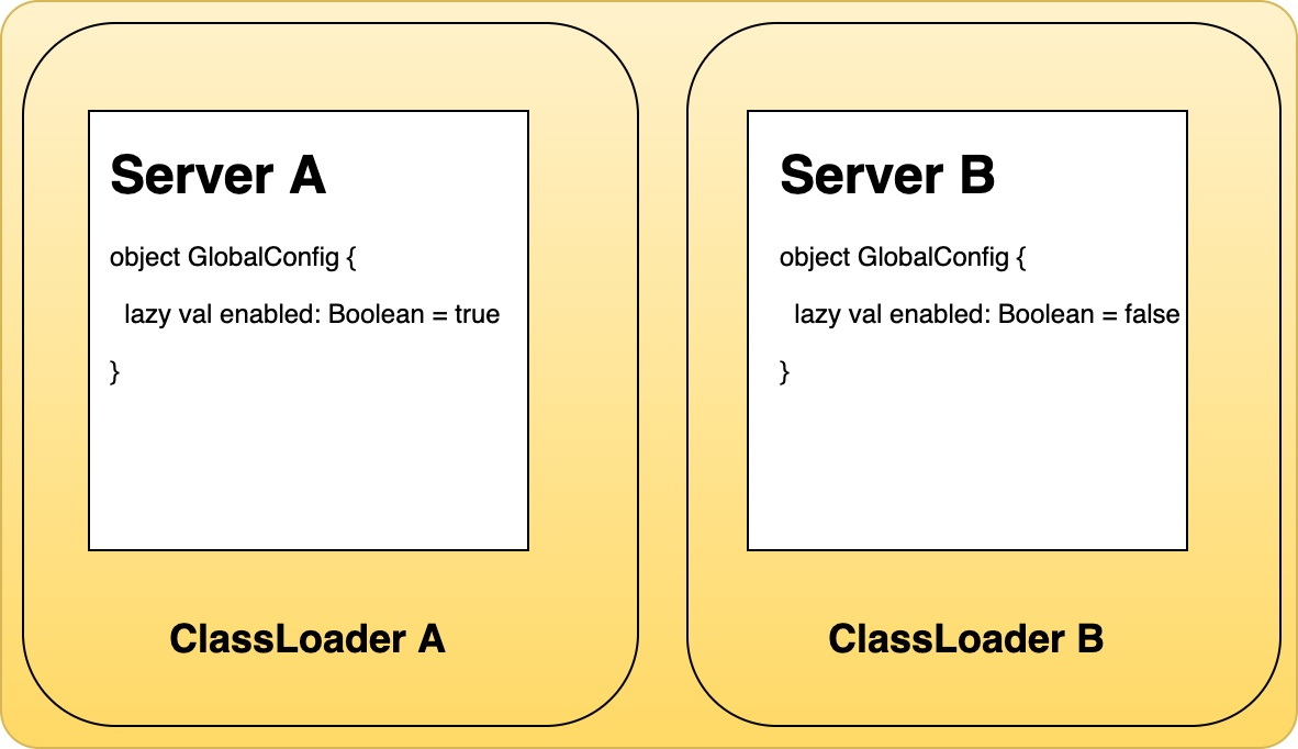 如上图,Server A 与 Server B 都有 GlobalConfig 对象,它们的类路径一致,包含的字段属性也一致,但是它们字段属性的值却不一样。如果将这两个服务作为依赖的方式引入到同一个项目里面运行,这种方式虽然简单但是没有解决模块之间的隔离型问题。会发生 A 会覆盖 B 或者 B 覆盖 A 的问题。