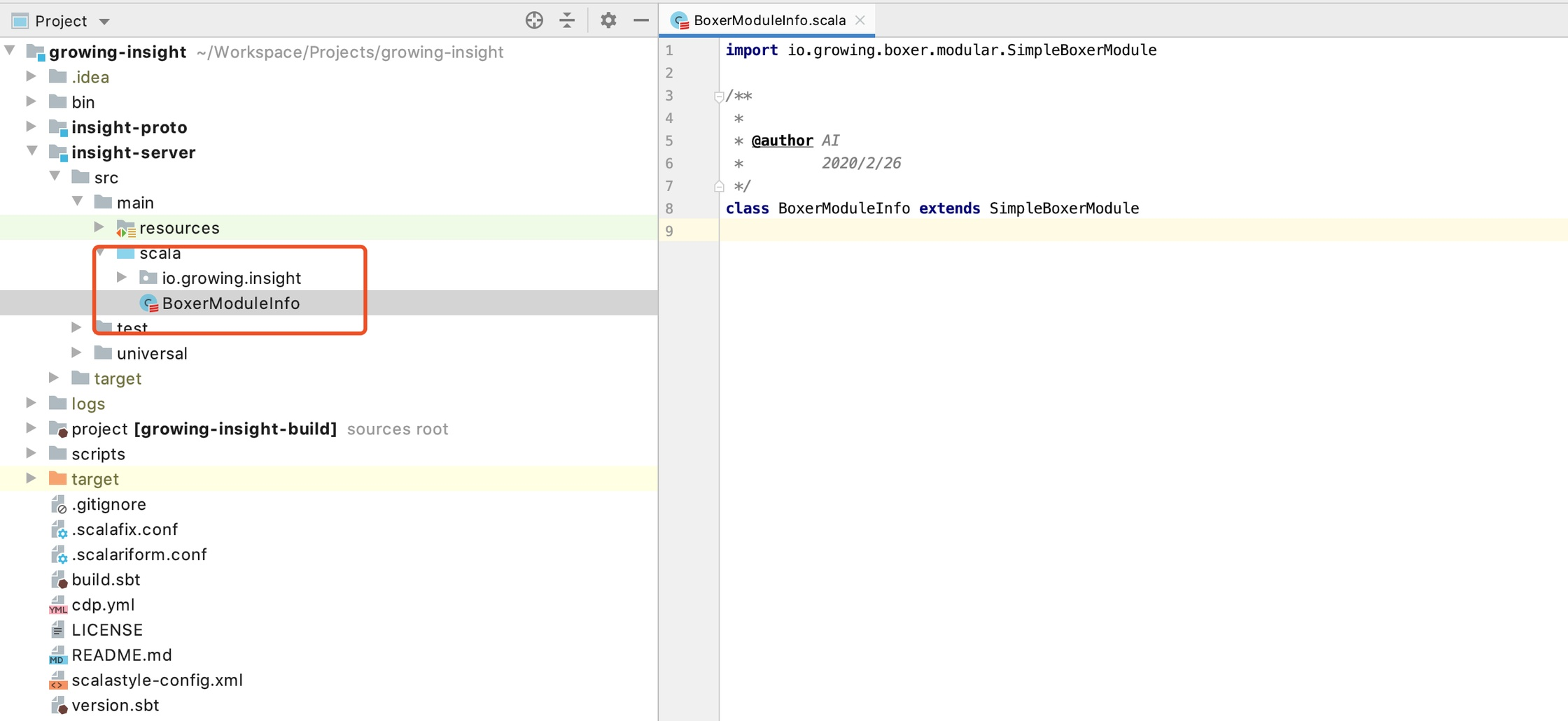 模块被加载成 ClassLoader 了,初始化模块就变得简单许多了。参考 Java 9 模块化的设计,我们为每个微服务加入了模块描述文件,如下图:我们在 growing-insight 服务里面加入了 BoxerModuleInfo 文件描述模块内容。