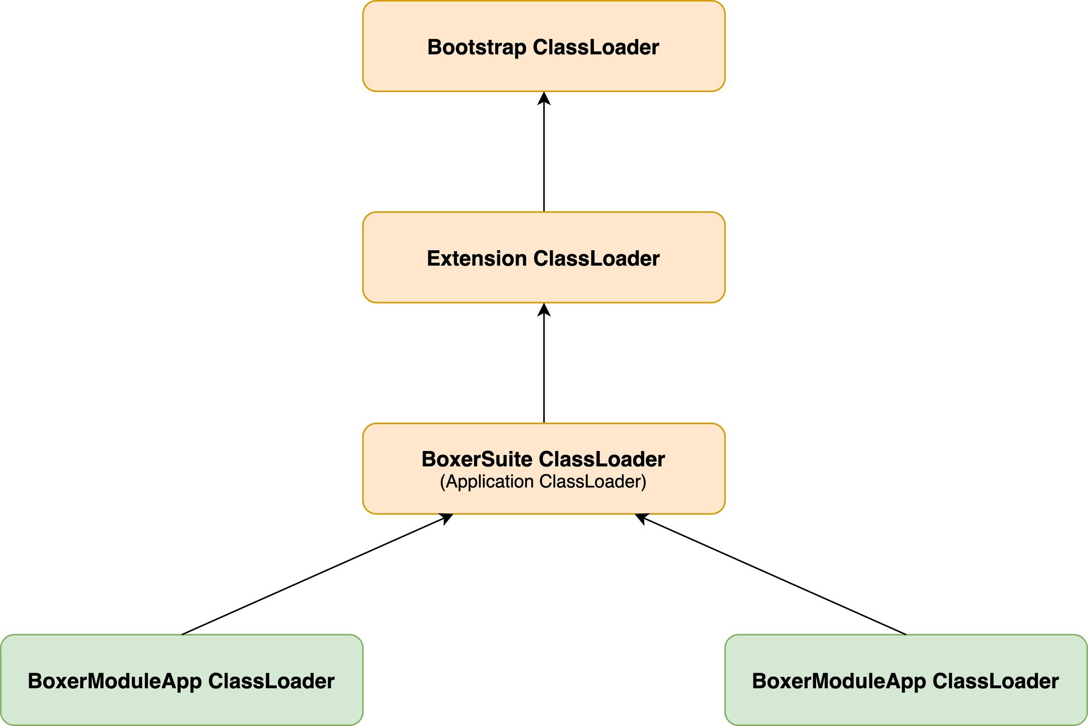 服务与服务(即模块与模块)之间,除了业务逻辑以及需要隔离的类之外,剩下的框架部分绝大部分是一致的,框架部分的类没有隔离的必要性。如下图,将不需要隔离性的框架类通过 BoxerSuiteClassLoader 管理可以提高内存空间利用率,因为 JVM 类加载器有双亲委派机制,ClassLoader 会优先从父 ClassLoader 加载类信息。