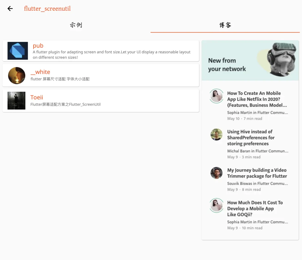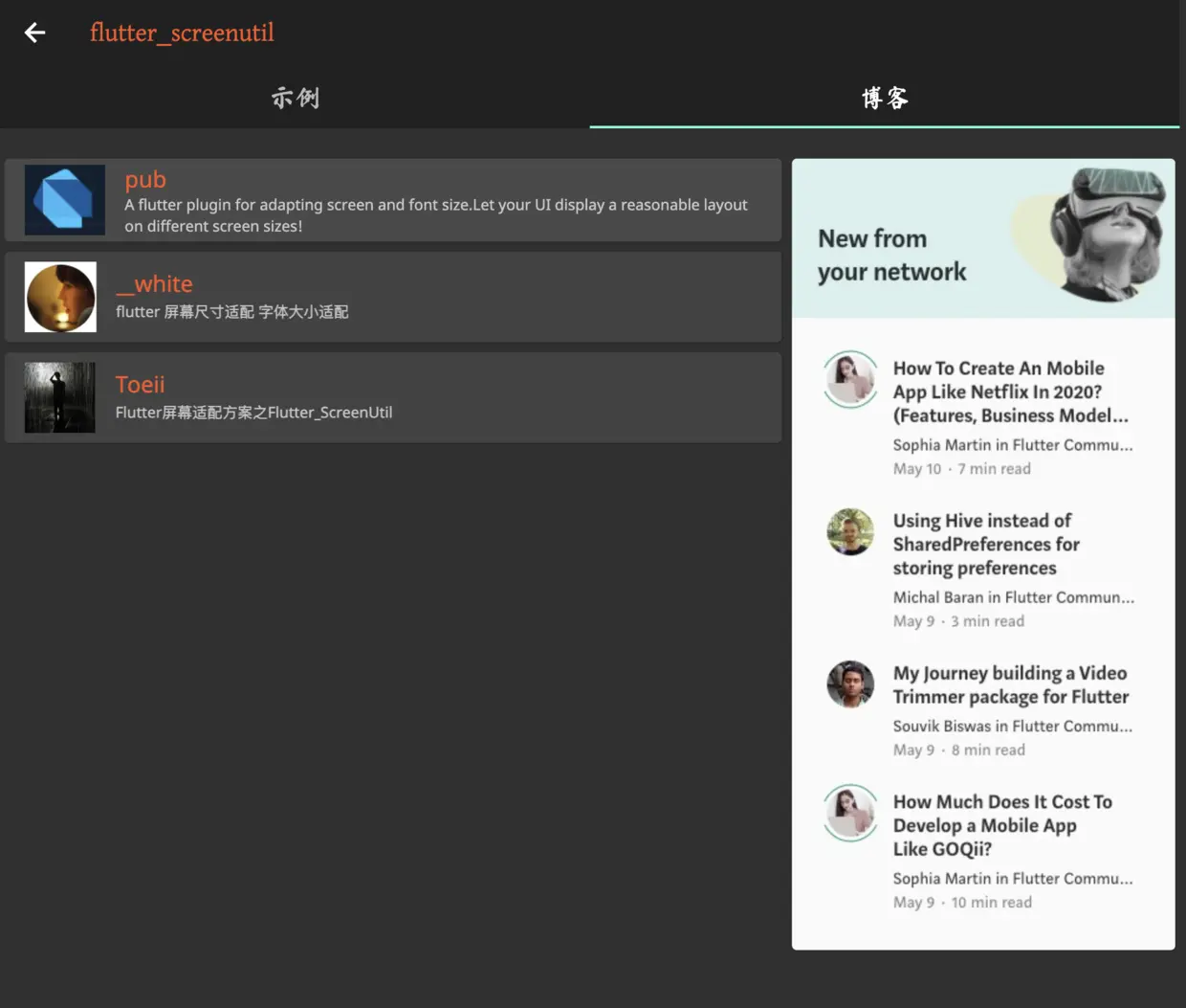 用Row将页面横向排列,用Expanded将页面三等分,左边占三分之二,用ListView.builder动态构建列表容器,并用Card+ ListTile展示卡片式的布局,ListTile设置左头像leading,主标题title,子标题subtitle,并添加点击事件onTap,实现博客url的跳转。
