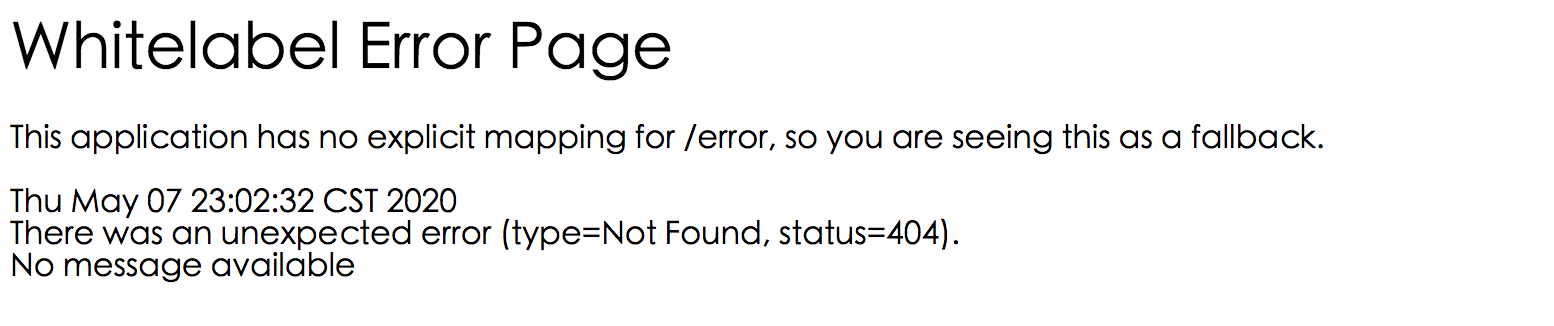 如果业务发生异常,那么这个接口就不会返回上面那样固定格式的数据了,会给我们返回错误页面。除了代码异常还有一种情况就是当访问的 Uri 错误的时候,也会给调用方返回 404 的错误页面,如下: