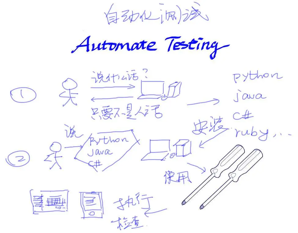 #自动化测试 接下来我们探讨一下主流的自动化测试方案,无一例外,都有人机沟通的编程语言,加上机器操作的工具来组成。