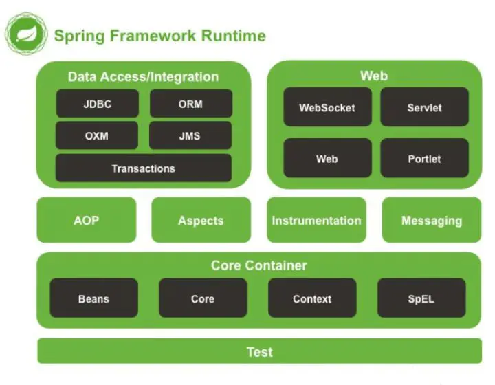 Spring框架至今已集成了20多个模块。这些模块主要被分如下图所示的核心容器、数据访问/集成,、Web、AOP(面向切面编程)、工具、消息和测试模块。