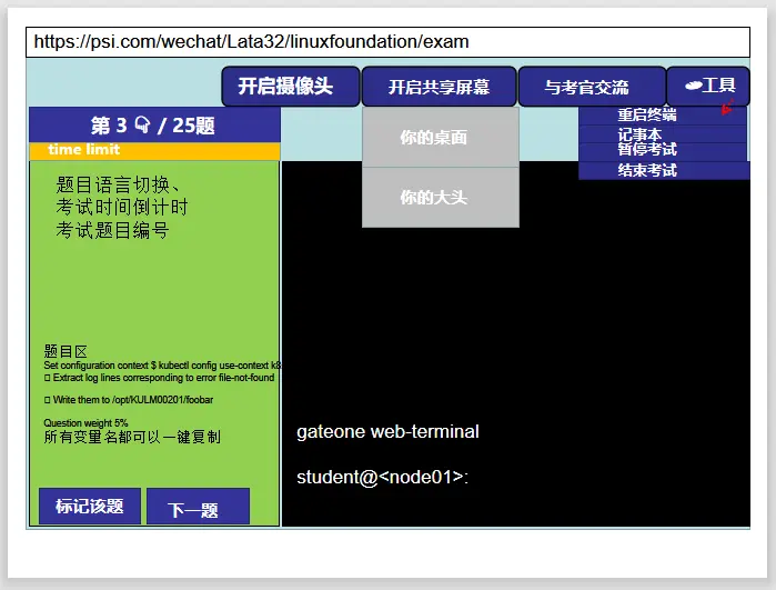 - 在考试过程中,考官需要你进行共享屏幕和共享摄像头,并且摄像头需要完整地能够看到你的脸的