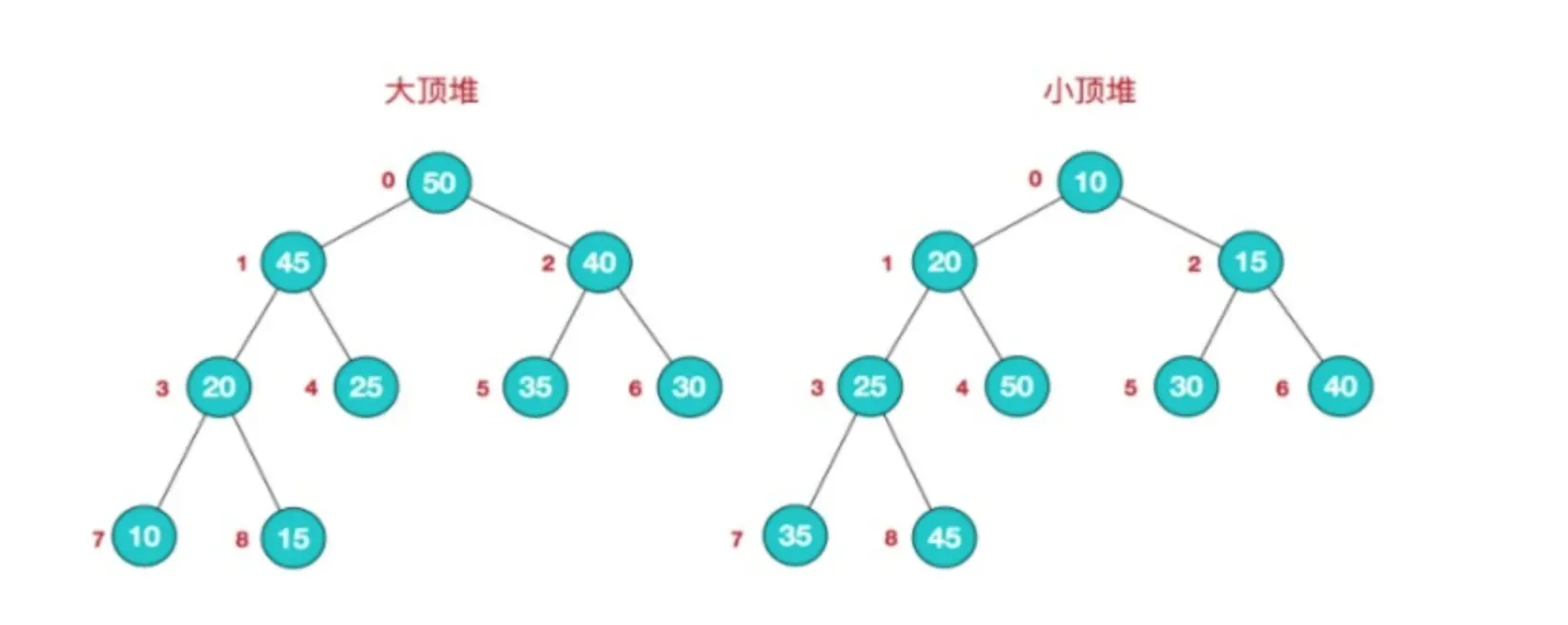 对于数组{50,45,40,20,25,35,30,10,15},大小顶堆如下所示:
