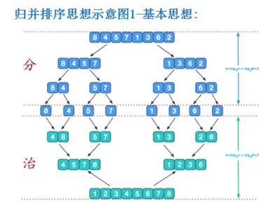 归并排序(merge sort)是利用归并思想实现的排序算法,该算法采用经典的分治(divide-and-conquer)策略(分治法将问题==分==成一些小的问题然后递归求解,而==治==的阶段则将分的阶段得到的各答案"修补"在一起,即分而治之)