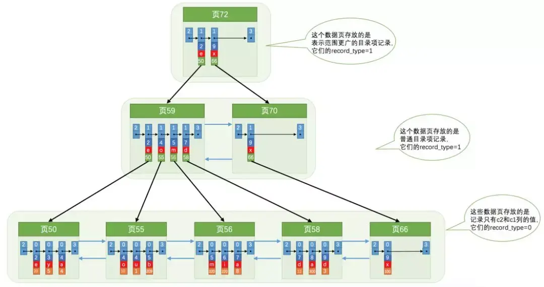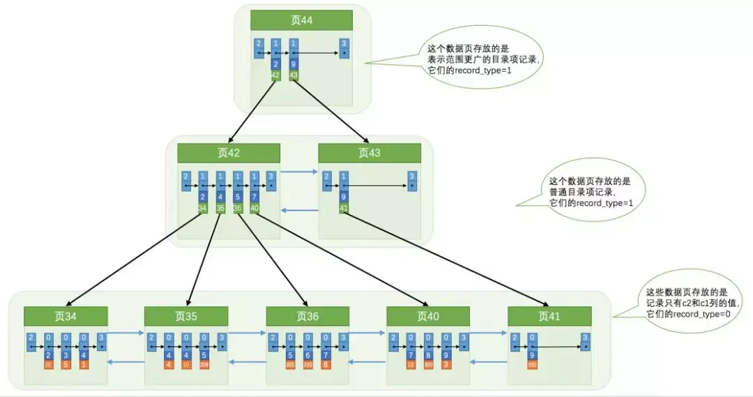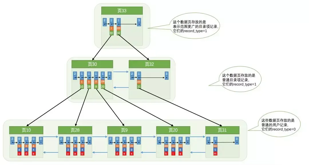 - 各个存放目录项的页也是根据页中记录的主键大小顺序排成一个双向链表。