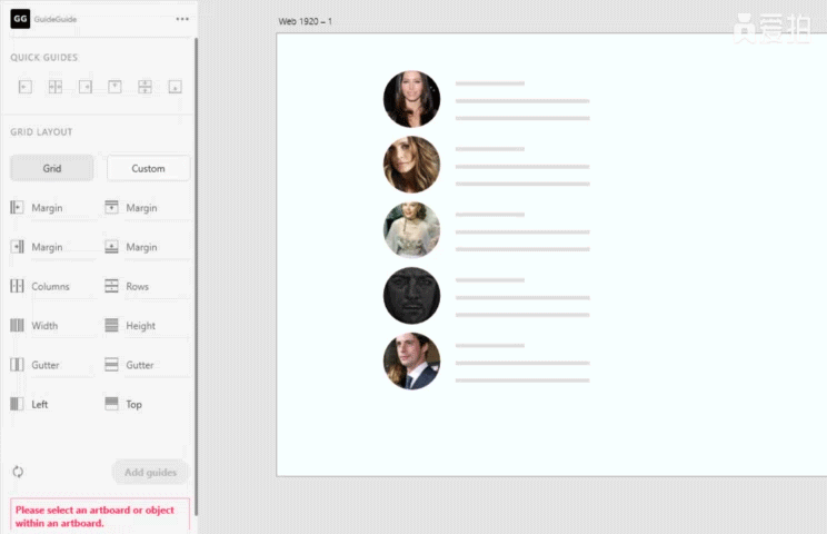 这个是智能生成参考线的插件,复用性极强,可以提高XD参考线的准确性,而且可以随时添加删除很方便(备注:使用的前提要选中界面元素或者参考线,否则插件下方会报错)