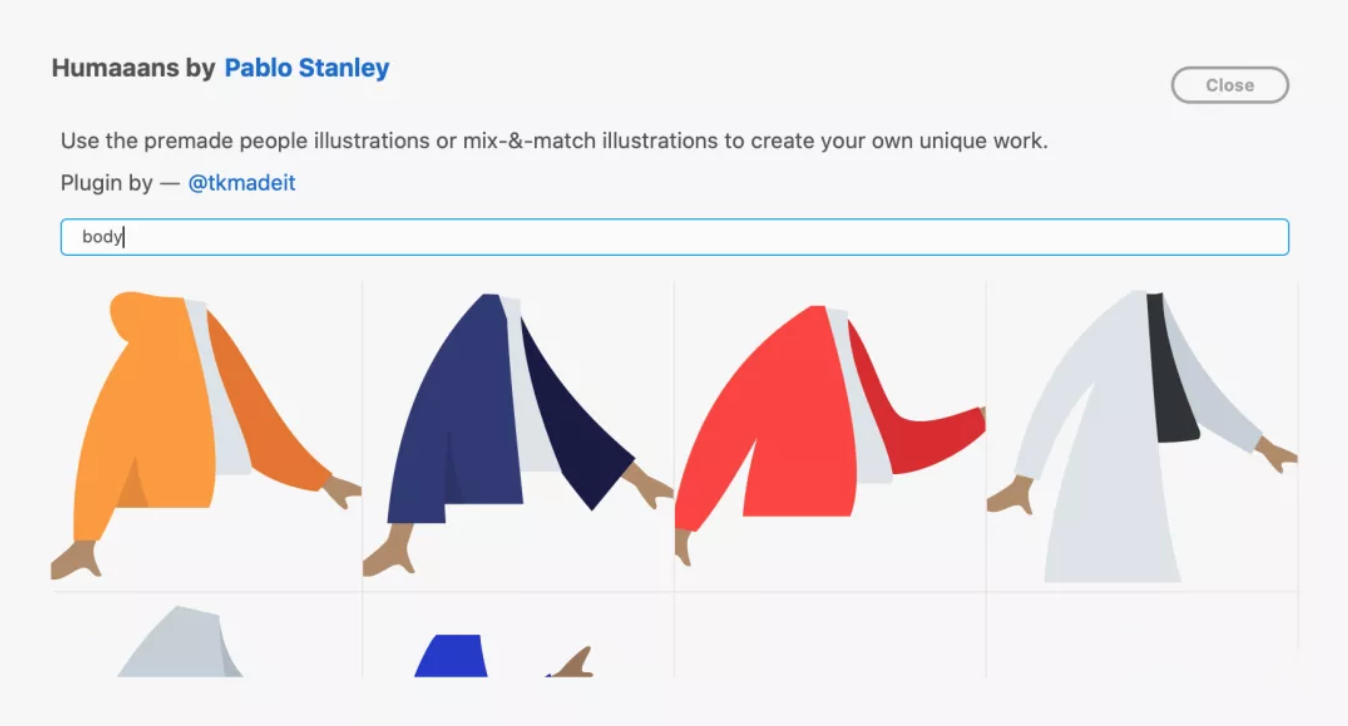 该插件是一个人物插画组件库,该插件并未使用插件画板,而是采取的弹窗,在插件面板中或菜单插件中点击插件名称会打开弹窗,直接展示全部人物插画组件,支持搜索功能,比如可以输入头、身体等关键词进行搜索。找到自己想要的组件之后,点击,插件会复制对应的svg代码到剪贴板,接下来点击“Done”按钮关闭弹窗,然后使用CTRL+v粘贴到画板中。