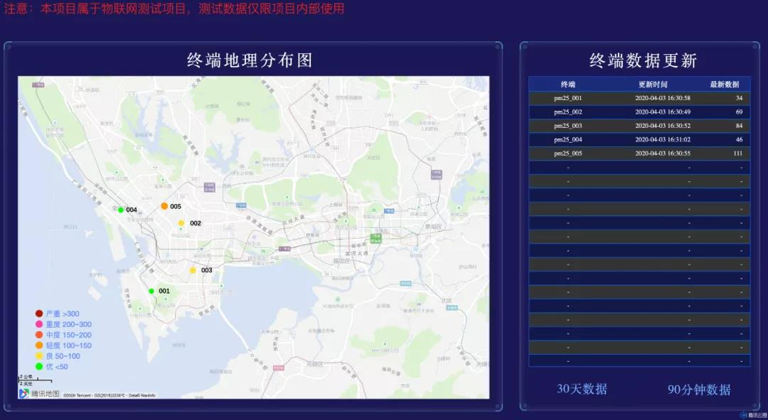 为了跟踪小区级的微环境质量,腾讯内部发起了一个实验性项目:细粒度的分布式大气监测。此系统完全基于腾讯云搭建,组成部分包含:腾讯云-物联网开发平台、TencentOS tiny、腾讯云-API网关、腾讯云-云函数、腾讯云-云数据库、腾讯云-腾讯云图,以及配套的 NUCLEO LoRa 开发套件、攀藤 PMS7003 颗粒物传感器等。