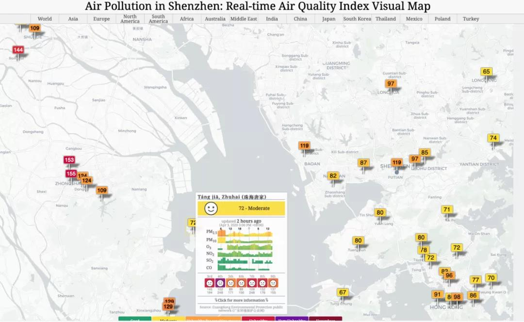 aqicn.org 虽然也是以小时为频率更新数据,但提供了地理维度的数据展示效果。从图中可以看到,顺德、中山出现了更高的监测指标,结合我们自己系统的污染源移动数据,初步的推断是:也许顺德、中山首先受到了影响,且污染气团进一步越过珠江,到达了深圳。